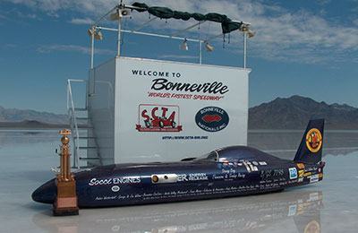 Our job then became one of designing and building a vehicle to fit inside that body. I have a photo of Ed and me sitting on his front porch on July 4, 1981. At that point, we had only a bare rolling chassis. Oh yes, one other small item, I was on crutches because I had blown out my knee, and Ed was going into the hospital for 10 days of traction on his back. We had the car on the salt for the Sept. Speed Week and came within 1.3 mph of the current record. We would chase that record until 1989. We made a lot of false moves, did some really dumb things and made our full share of rookie mistakes. Ed always said “if you build like everyone else, you will run like everyone else”. Trust me, there was more than one point that we both wished that we would run like everyone else. We set our first of many records in 1989 at 262.848 mph.